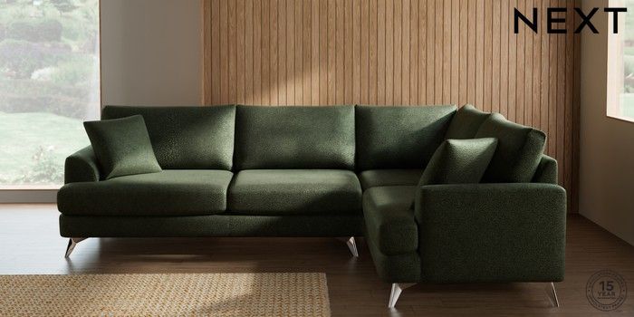 7.2.10 Buy Parker Large Corner Sofa - Right Hand Boucle Chenille Dark Moss Green High Metal - Chrome from the Next UK online shop Click here to use our accessible website