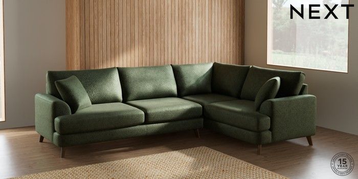 7.2.5 Buy Parker Large Corner Sofa - Right Hand Boucle Chenille Dark Moss Green Low Retro Tapered - Mid from the Next UK online shop Click here to use our accessible website