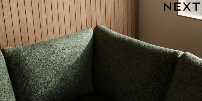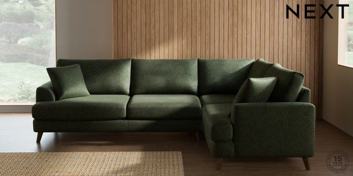7.2.10 Buy Parker Large Corner Sofa - Right Hand Boucle Chenille Dark Moss Green Low Retro Tapered - Mid from the Next UK online shop Click here to use our accessible website