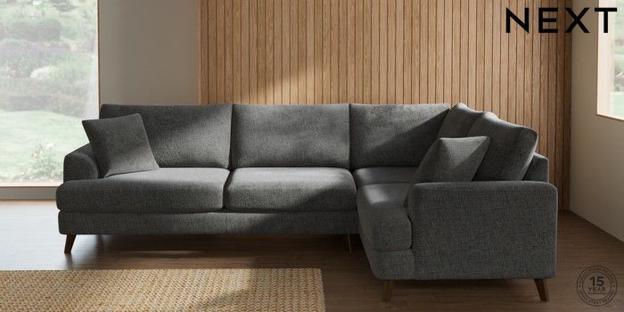 7.2.10 Buy Parker Large Corner Sofa - Right Hand Chunky Chenille Dark Grey Low Retro Tapered - Mid from the Next UK online shop Click here to use our accessible website
