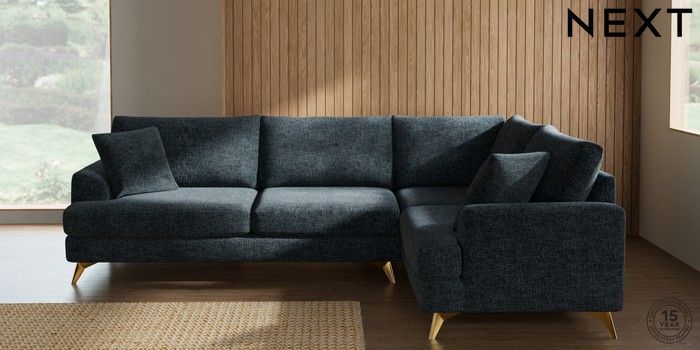 7.2.10 Buy Parker Large Corner Sofa - Right Hand Chunky Chenille Dark Navy Blue High Metal - Brass from the Next UK online shop Click here to use our accessible website