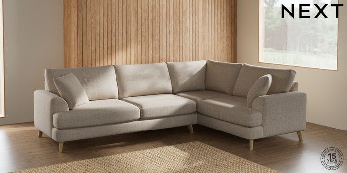 7.2.6 Buy Parker Large Corner Sofa - Right Hand Chunky Weave Mid Natural Low Retro Tapered - Light from the Next UK online shop Click here to use our accessible website