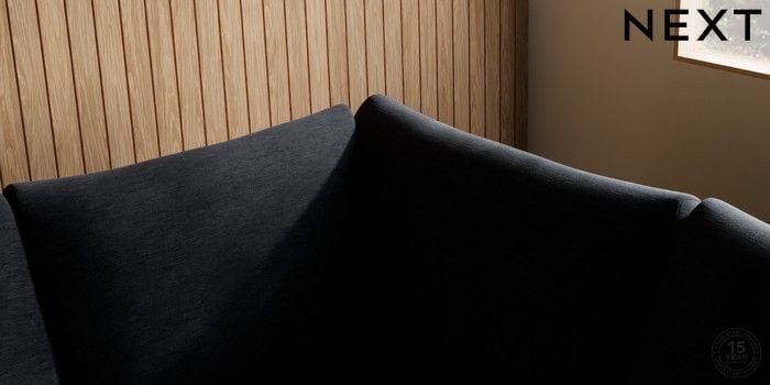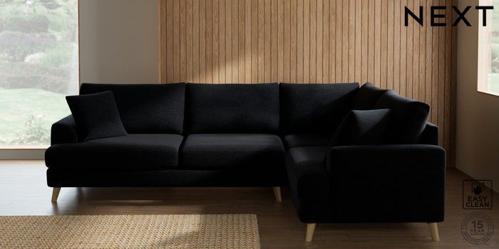 7.2.10 Buy Parker Large Corner Sofa - Right Hand Fine Chenille Easy Clean Black Low Retro Tapered - Light from the Next UK online shop Click here to use our accessible website