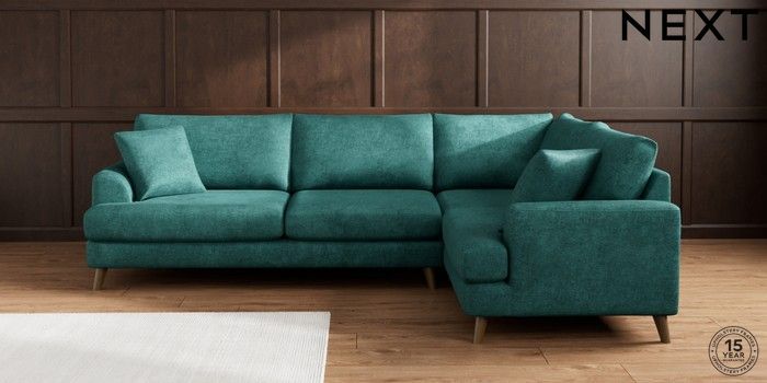 7.2.10 Buy Parker Large Corner Sofa - Right Hand Plush Chenille Dark Teal Green Low Retro Tapered - Mid from the Next UK online shop Click here to use our accessible website
