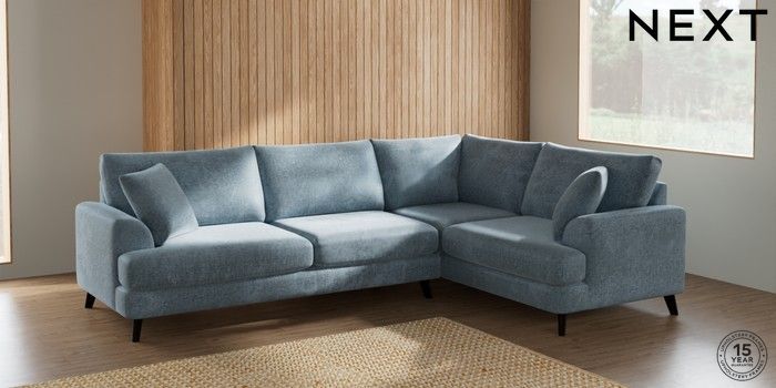 7.2.6 Buy Parker Large Corner Sofa - Right Hand Plush Chenille Light Blue Low Retro Tapered - Dark from the Next UK online shop Click here to use our accessible website
