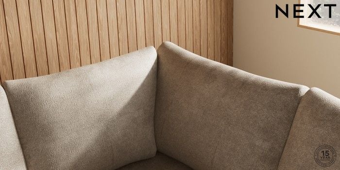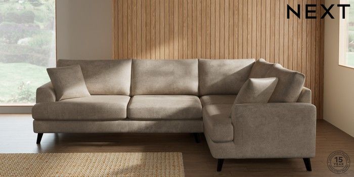 7.2.10 Buy Parker Large Corner Sofa - Right Hand Plush Chenille Light Natural Low Retro Tapered - Dark from the Next UK online shop Click here to use our accessible website