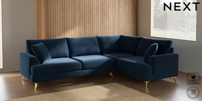 7.2.5 Buy Parker Large Corner Sofa - Right Hand Plush Velvet Easy Clean Airforce Blue High Metal - Brass from the Next UK online shop Click here to use our accessible website