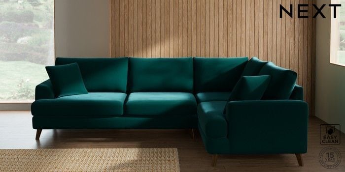7.2.10 Buy Parker Large Corner Sofa - Right Hand Plush Velvet Easy Clean Juniper Green Low Retro Tapered - Mid from the Next UK online shop Click here to use our accessible website