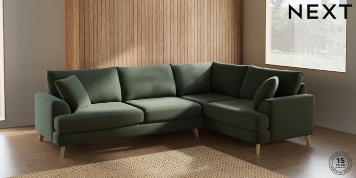 7.2.5 Buy Parker Large Corner Sofa - Right Hand Relaxed Linen Look Dark Green Low Retro Tapered - Light from the Next UK online shop Click here to use our accessible website