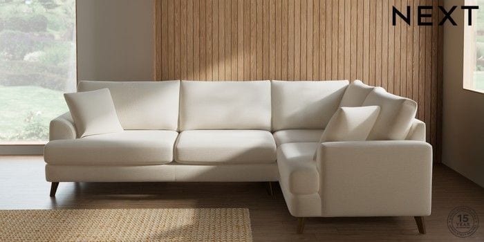 7.2.10 Buy Parker Large Corner Sofa - Right Hand Ripple Chenille Oyster Low Retro Tapered - Mid from the Next UK online shop Click here to use our accessible website