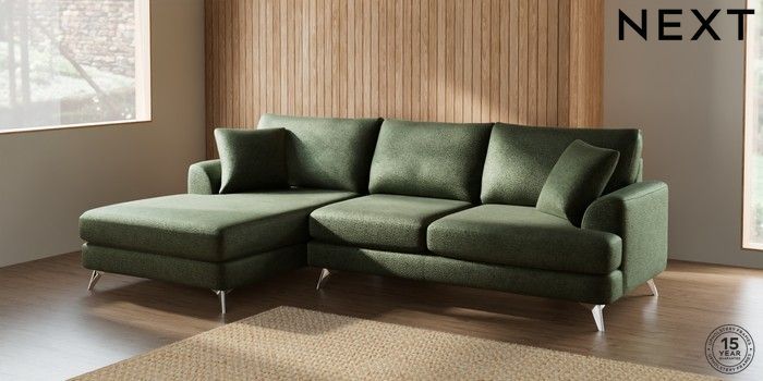 7.2.5 Buy Parker Large Sofa Chaise - Left Hand Boucle Chenille Dark Moss Green High Metal - Chrome from the Next UK online shop Click here to use our accessible website