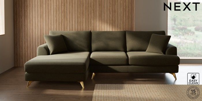 7.3.1 Buy Parker Large Sofa Chaise - Left Hand Fine Chenille Easy Clean Dark Moss Green High Metal - Brass from the Next UK online shop Click here to use our accessible website