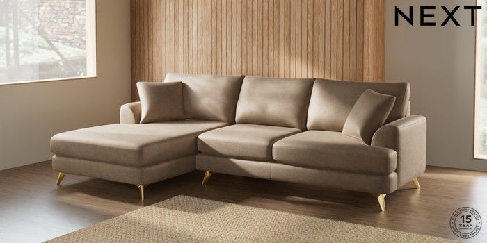 7.2.5 Buy Parker Large Sofa Chaise - Left Hand Luxe Chenille Mid Camel Beige High Metal - Brass from the Next UK online shop Click here to use our accessible website
