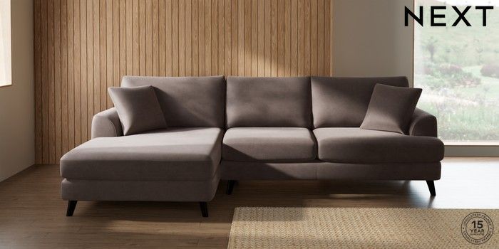 7.2.10 Buy Parker Large Sofa Chaise - Left Hand Luxe Chenille Mink Brown Low Retro Tapered - Dark from the Next UK online shop Click here to use our accessible website