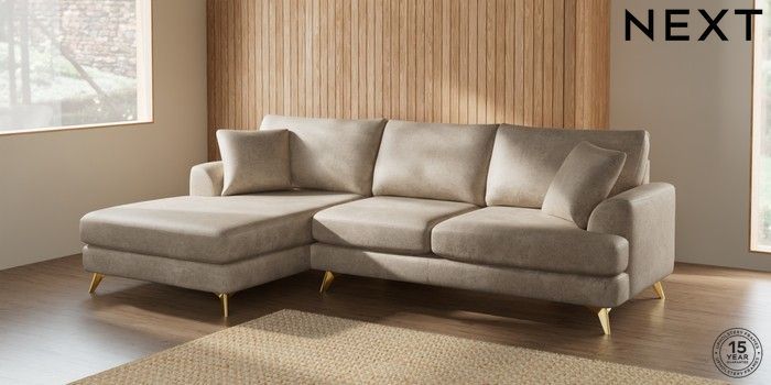 7.2.5 Buy Parker Large Sofa Chaise - Left Hand Plush Chenille Light Natural High Metal - Brass from the Next UK online shop Click here to use our accessible website