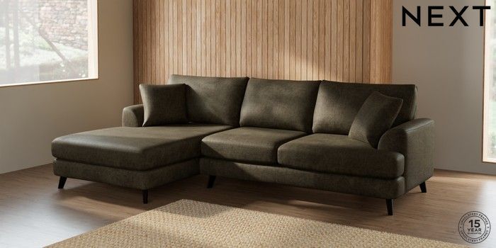7.2.5 Buy Parker Large Sofa Chaise - Left Hand Plush Chenille Moss Green Low Retro Tapered - Dark from the Next UK online shop Click here to use our accessible website