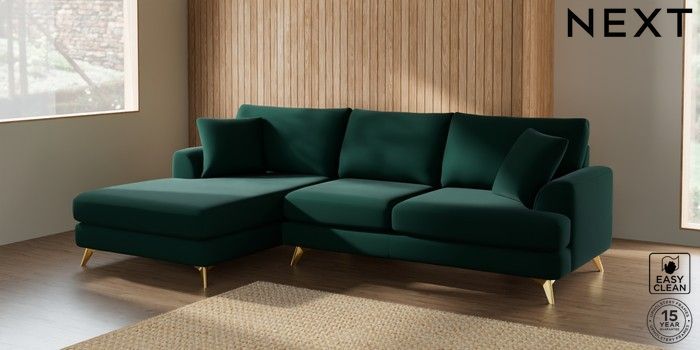 7.2.5 Buy Parker Large Sofa Chaise - Left Hand Plush Velvet Easy Clean Bottle Green High Metal - Brass from the Next UK online shop Click here to use our accessible website