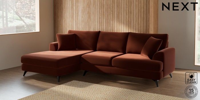7.2.5 Buy Parker Large Sofa Chaise - Left Hand Plush Velvet Easy Clean Ginger Orange High Metal - Black from the Next UK online shop Click here to use our accessible website