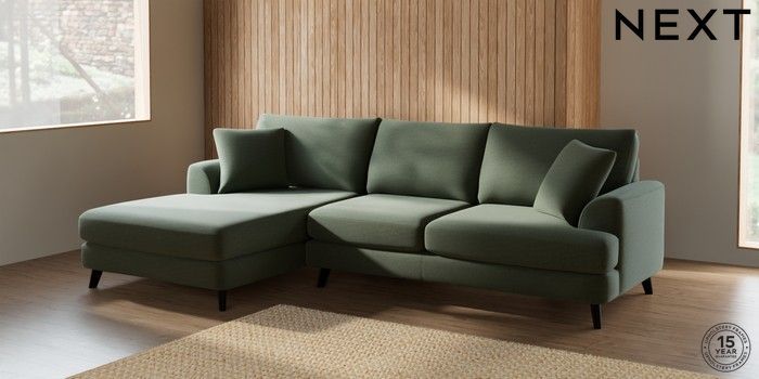 7.2.5 Buy Parker Large Sofa Chaise - Left Hand Relaxed Linen Look Dark Green Low Retro Tapered - Dark from the Next UK online shop Click here to use our accessible website