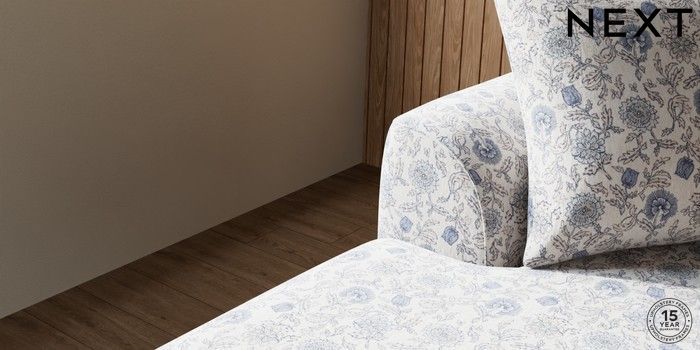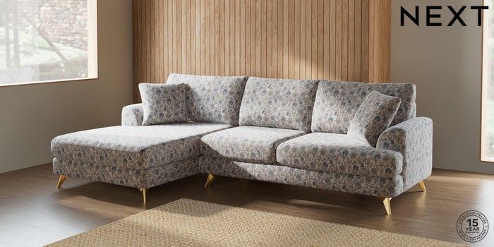 7.3.1 Buy Parker Large Sofa Chaise - Left Hand Relaxed Linen Look Print Woodblock Floral Blue High Metal - Brass from the Next UK online shop