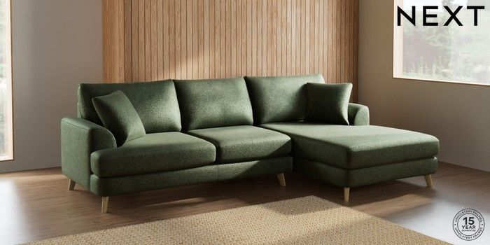 7.2.5 Buy Parker Large Sofa Chaise - Right Hand Boucle Chenille Dark Moss Green Low Retro Tapered - Light from the Next UK online shop Click here to use our accessible website