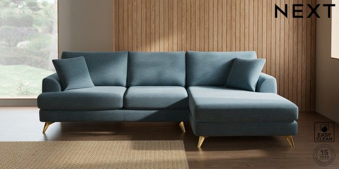 7.3.1 Buy Parker Large Sofa Chaise - Right Hand Fine Chenille Easy Clean Mid Blue High Metal - Brass from the Next UK online shop Click here to use our accessible website