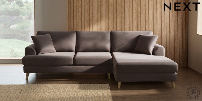 7.2.10 Buy Parker Large Sofa Chaise - Right Hand Luxe Chenille Mink Brown Low Retro Tapered - Light from the Next UK online shop Click here to use our accessible website