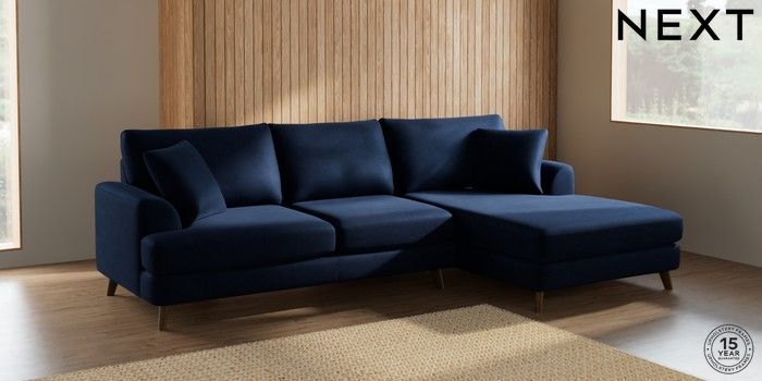 7.0.3 Buy Parker Large Sofa Chaise - Right Hand Luxe Chenille Navy Blue Low Retro Tapered - Mid from the Next UK online shop Click here to use our accessible website