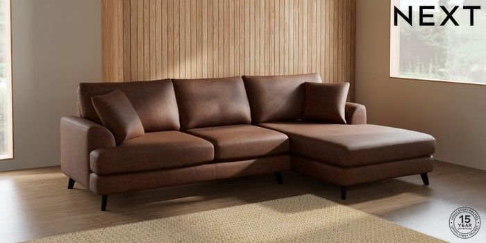 7.2.5 Buy Parker Large Sofa Chaise - Right Hand Monza Faux Leather Easy Clean Chestnut Brown Low Retro Tapered - Dark from the Next UK online shop Click here to use our accessible website