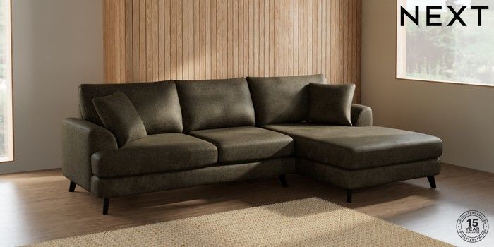 7.2.5 Buy Parker Large Sofa Chaise - Right Hand Plush Chenille Moss Green Low Retro Tapered - Dark from the Next UK online shop Click here to use our accessible website