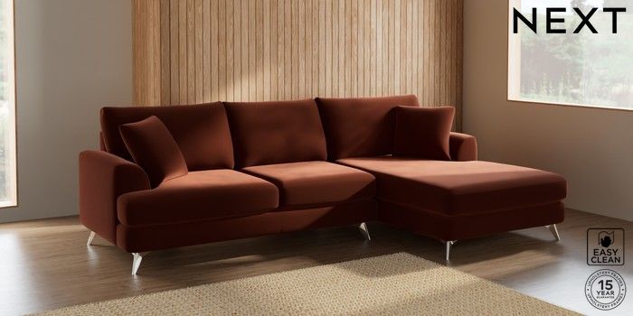 7.2.5 Buy Parker Large Sofa Chaise - Right Hand Plush Velvet Easy Clean Ginger Orange High Metal - Chrome from the Next UK online shop Click here to use our accessible website