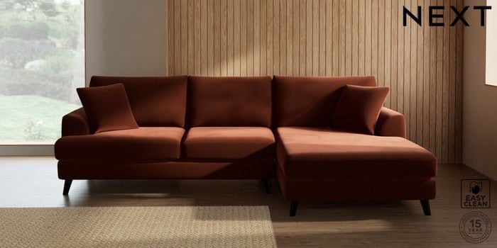 7.3.1 Buy Parker Large Sofa Chaise - Right Hand Plush Velvet Easy Clean Ginger Orange Low Retro Tapered - Dark from the Next UK online shop Click here to use our accessible website