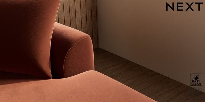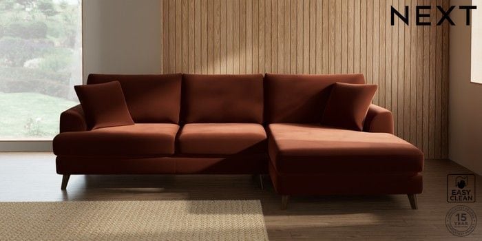 7.2.10 Buy Parker Large Sofa Chaise - Right Hand Plush Velvet Easy Clean Ginger Orange Low Retro Tapered - Mid from the Next UK online shop Click here to use our accessible website