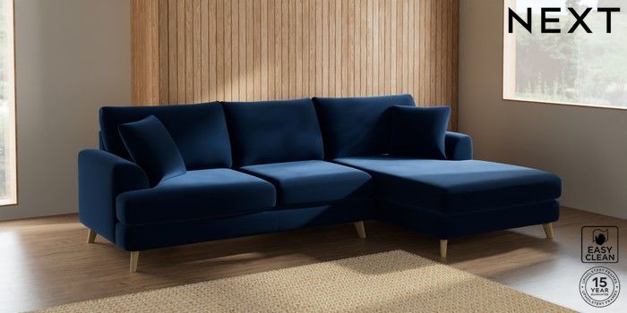 7.2.5 Buy Parker Large Sofa Chaise - Right Hand Plush Velvet Easy Clean Navy Blue Low Retro Tapered - Light from the Next UK online shop Click here to use our accessible website
