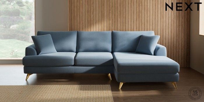 7.3.1 Buy Parker Large Sofa Chaise - Right Hand Relaxed Linen Look Mid Blue High Metal - Brass from the Next UK online shop Click here to use our accessible website