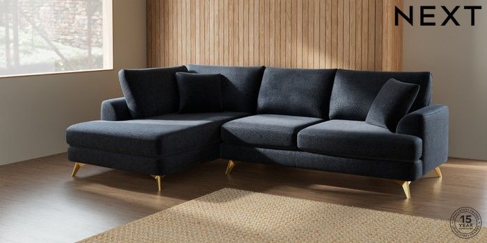 7.2.5 Buy Parker Medium Corner Chaise - Left Hand Boucle Chenille Dark Slate Blue High Metal - Brass from the Next UK online shop Click here to use our accessible website