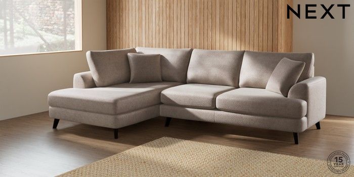 7.2.5 Buy Parker Medium Corner Chaise - Left Hand Boucle Chenille Light Natural Low Retro Tapered - Dark from the Next UK online shop Click here to use our accessible website