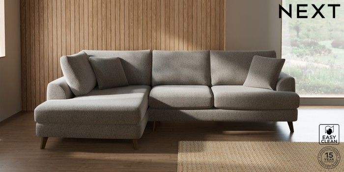 7.2.10 Buy Parker Medium Corner Chaise - Left Hand Chunky Boucle Easy Clean Dove Low Retro Tapered - Mid from the Next UK online shop Click here to use our accessible website