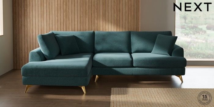 7.2.10 Buy Parker Medium Corner Chaise - Left Hand Chunky Chenille Mid Teal Green High Metal - Brass from the Next UK online shop Click here to use our accessible website