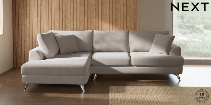 7.2.10 Buy Parker Medium Corner Chaise - Left Hand Chunky Chenille Oyster High Metal - Chrome from the Next UK online shop Click here to use our accessible website