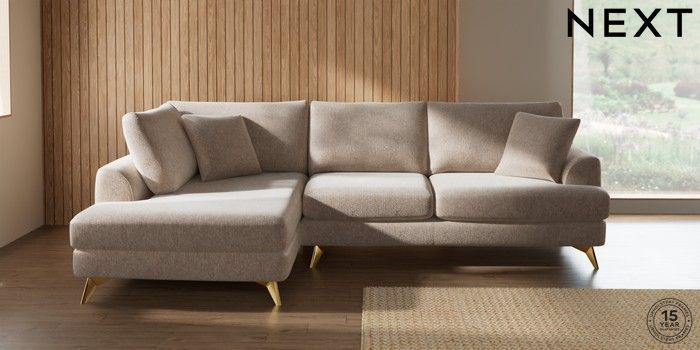 7.2.10 Buy Parker Medium Corner Chaise - Left Hand Cotswold Chenille Light Natural High Metal - Brass from the Next UK online shop Click here to use our accessible website