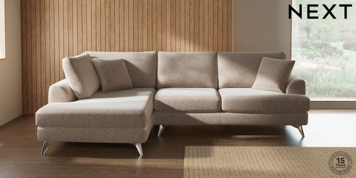 7.2.10 Buy Parker Medium Corner Chaise - Left Hand Cotswold Chenille Light Natural High Metal - Chrome from the Next UK online shop Click here to use our accessible website