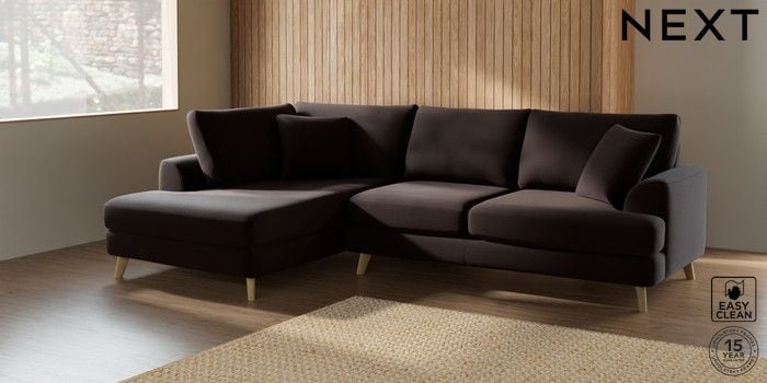 7.2.5 Buy Parker Medium Corner Chaise - Left Hand Fine Chenille Easy Clean Chocolate Brown Low Retro Tapered - Light from the Next UK online shop Click here to use our accessible website