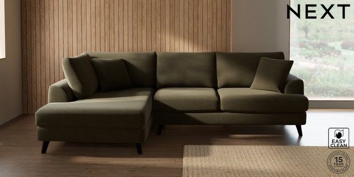 7.3.1 Buy Parker Medium Corner Chaise - Left Hand Fine Chenille Easy Clean Dark Moss Green Low Retro Tapered - Dark from the Next UK online shop Click here to use our accessible website