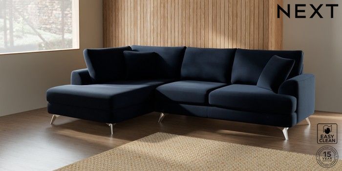 7.2.5 Buy Parker Medium Corner Chaise - Left Hand Fine Chenille Easy Clean Dark Navy Blue High Metal - Chrome from the Next UK online shop Click here to use our accessible website