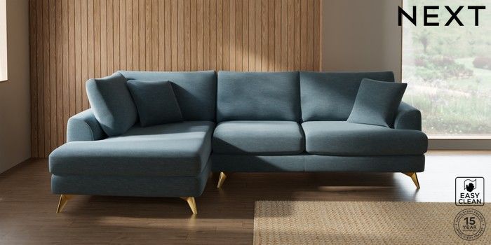 7.2.10 Buy Parker Medium Corner Chaise - Left Hand Fine Chenille Easy Clean Mid Blue High Metal - Brass from the Next UK online shop Click here to use our accessible website