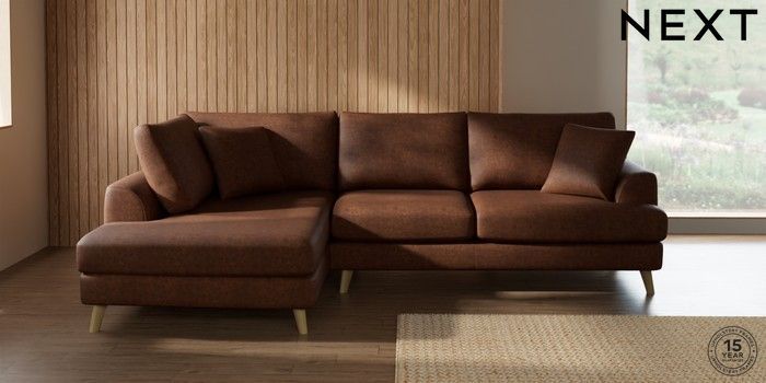 7.3.1 Buy Parker Medium Corner Chaise - Left Hand Monza Faux Leather Easy Clean Chestnut Brown Low Retro Tapered - Light from the Next UK online shop Click here to use our accessible website