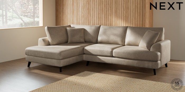 7.2.5 Buy Parker Medium Corner Chaise - Left Hand Plush Chenille Light Natural Low Retro Tapered - Dark from the Next UK online shop Click here to use our accessible website