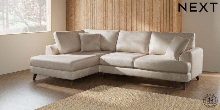7.2.6 Buy Parker Medium Corner Chaise - Left Hand Plush Chenille Oyster Low Retro Tapered - Mid from the Next UK online shop Click here to use our accessible website