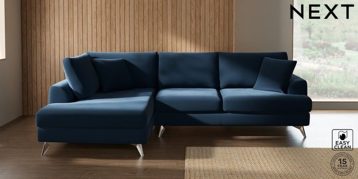 7.3.1 Buy Parker Medium Corner Chaise - Left Hand Plush Velvet Easy Clean Airforce Blue High Metal - Chrome from the Next UK online shop Click here to use our accessible website